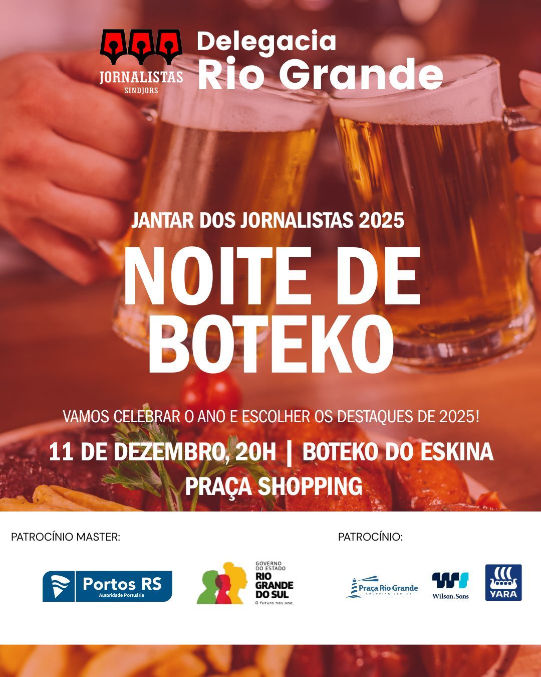 O evento marca o encerramento de mais um ano de muito trabalho para os profissionais da imprensa local. Nesta edição, serão escolhidos os destaques do ano nas categorias Jornalista Corporativo e Jornalista de Redação. O Jantar dos Jornalistas tem o patrocínio da Portos RS – Governo do Estado do Rio Grande, Tecon Rio Grande/Wilson Sons, Yara Brasil e Praça Rio Grande Shopping Center.