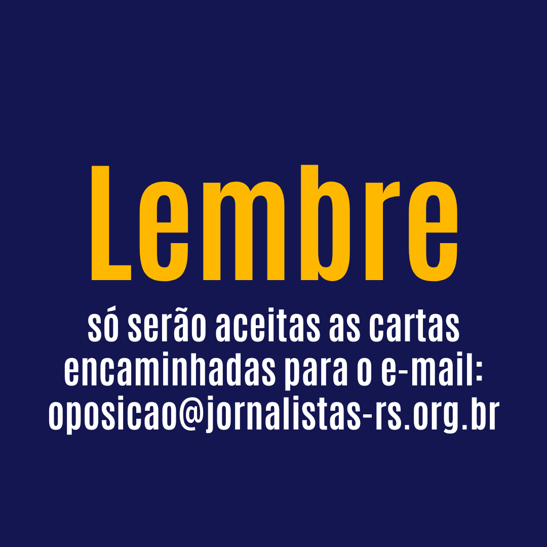 ENCAMINHAR PARA O E-MAIL oposicao@jornalistas-rs.org.br COM CÓPIA DO DOCUMENTO DE IDENTIFICAÇÃO. Se possível, reproduza as informações no corpo do e-mail.