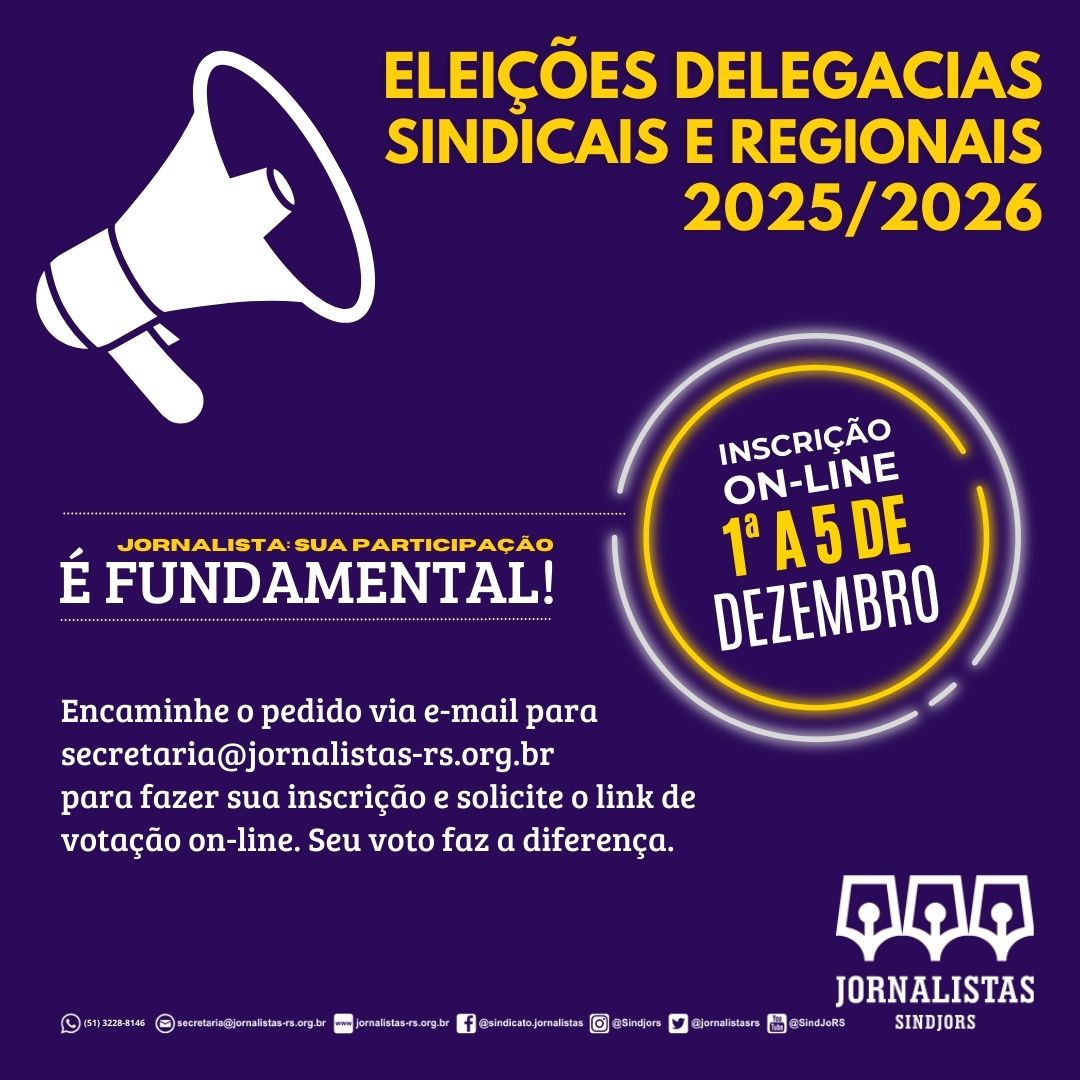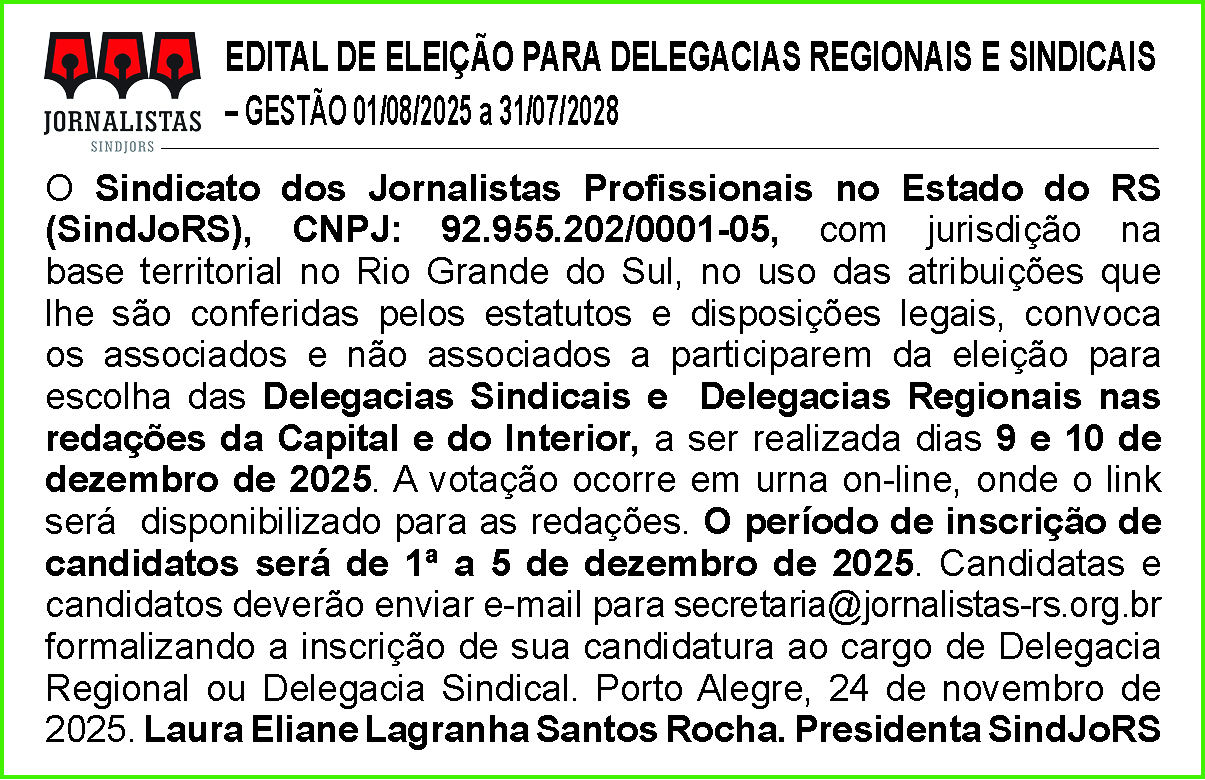 O Sindicato dos Jornalistas Profissionais no Estado do RS (SindJoRS), CNPJ: 92.955.202/0001-05, com jurisdição na base territorial no Rio Grande do Sul, no uso das atribuições que lhe são conferidas pelos estatutos e disposições legais, convoca os associados e não associados a participarem da eleição para escolha dos Delegados Sindicais e Regionais nas redações da Capital e Interior, a ser realizada dias 9 e 10 de dezembro de 2025. A votação ocorre em urna on-line, onde o link será disponibilizado para as redações. O período de inscrição de candidatos será de 1ª a 5 de dezembro de 2025. Candidatas e candidatos deverão enviar e-mail para secretaria@jornalistas-rs.org.br formalizando a inscrição de sua candidatura ao cargo de Delegacia Regional ou Delegacia Sindical. Porto Alegre, 24 de novembro de 2025. Laura Eliane Lagranha Santos Rocha. Presidenta SindJoRS