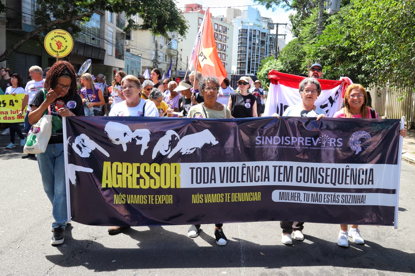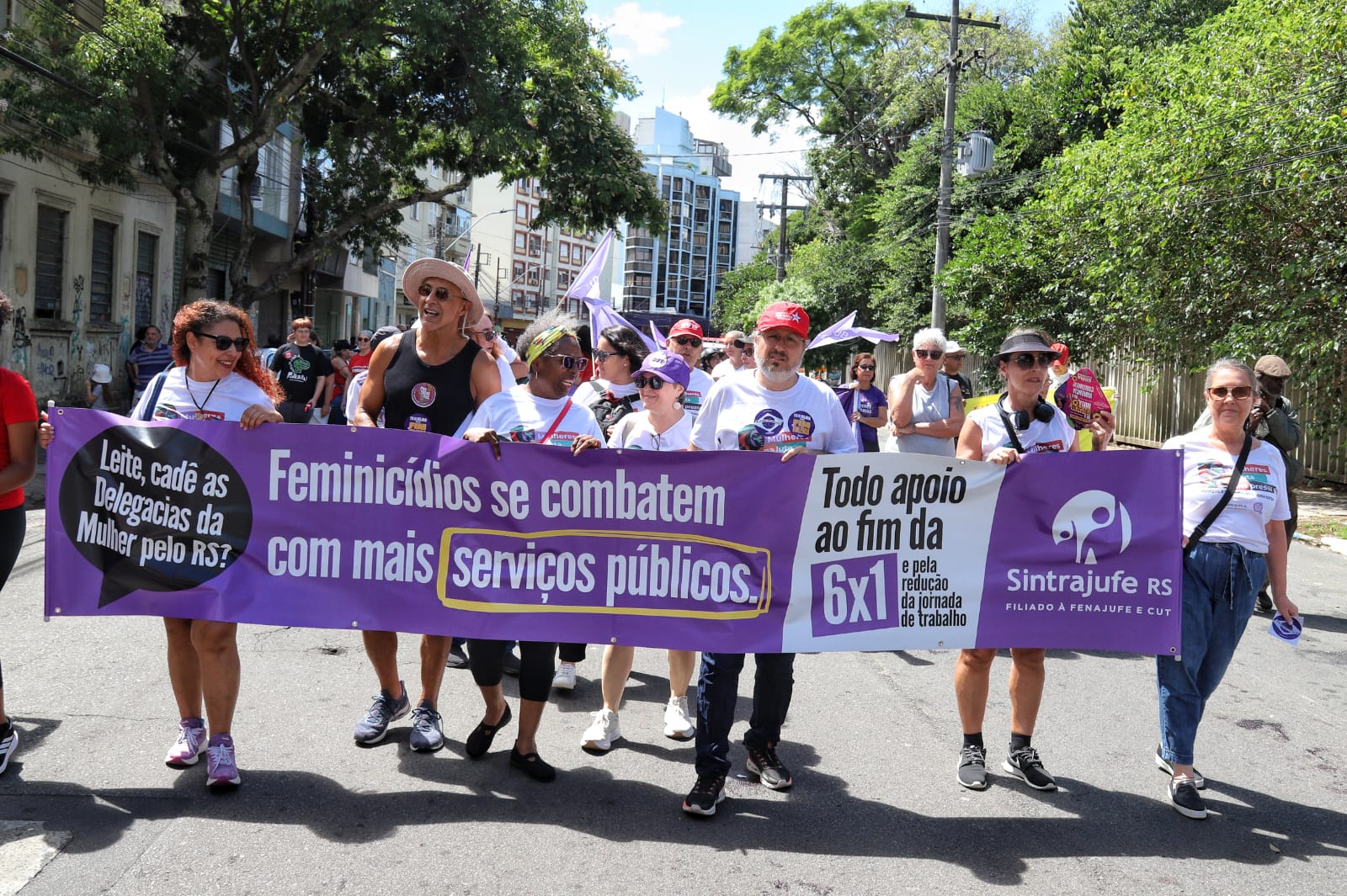Além da defesa da vida das mulheres, o ato também reivindicou o fim da escala 6×1, entre outras pautas sociais. A presidenta do SindJoRS, Laura Santos Rocha, defende que todas as entidades sindicais devem unir forças neste momento em que mulheres, na sua maioria trabalhadoras de diferentes segmentos, estão sendo assassinadas. “Nós, do SindJoRS, temos ainda o dever de reivindicar que a imprensa altere a forma como retrata esses acontecimentos. A mulher é vítima das diferentes formas de agressão. Então, quem precisa estar estampado nas capas dos diferentes veículos é o homem. Ele é quem precisa ter vergonha dos seus atos. Precisamos unir forças e falar sobre o assunto para acabar com qualquer tipo de agressão. Violência contra as mulheres nunca mais”.